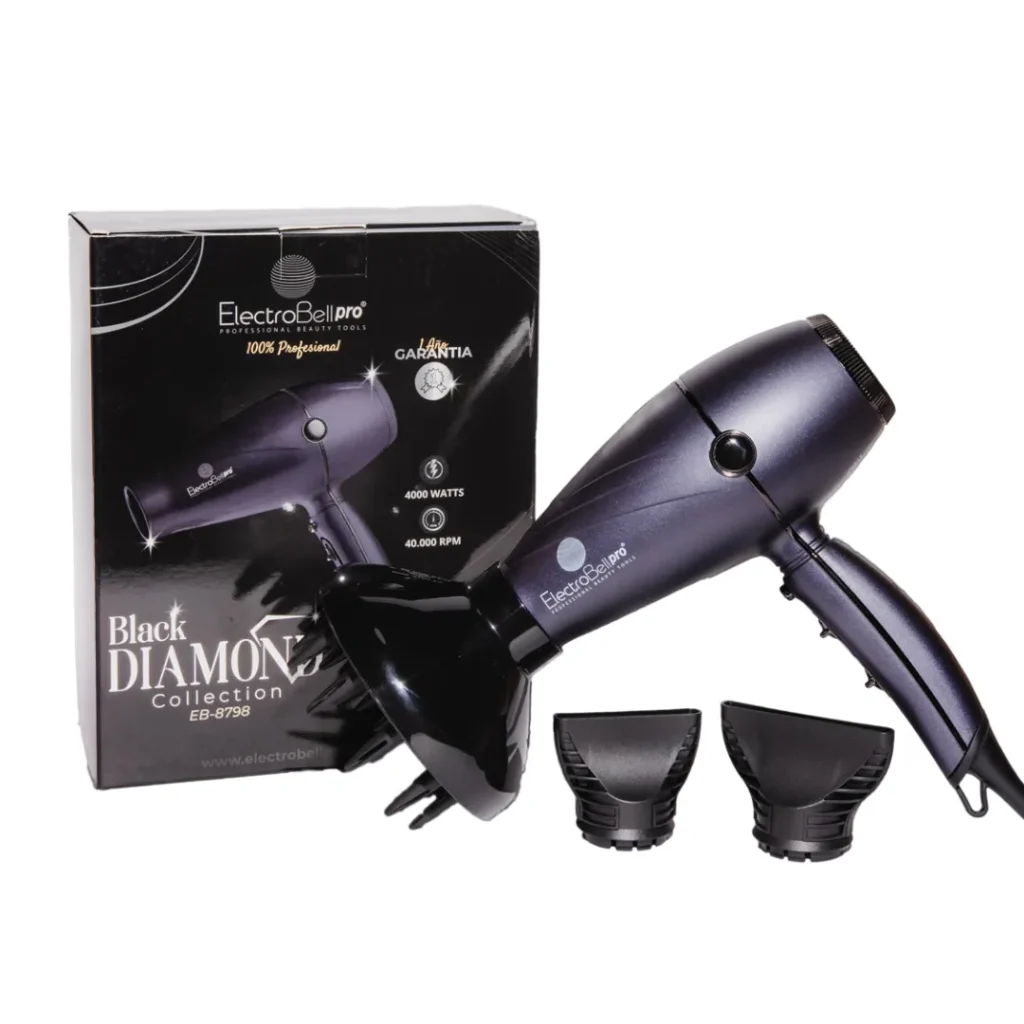 El Secador Black Diamond Dark Blue EB-8798, parte de la exclusiva Colección Black Diamond, ofrece una experiencia de secado superior. Este dispositivo es ergonómico, ligero y silencioso, transformando tu cabello al evitar el encrespamiento y el efecto magnético, recuperando así un brillo natural deslumbrante. Disfruta de una herramienta profesional de gran calidad.